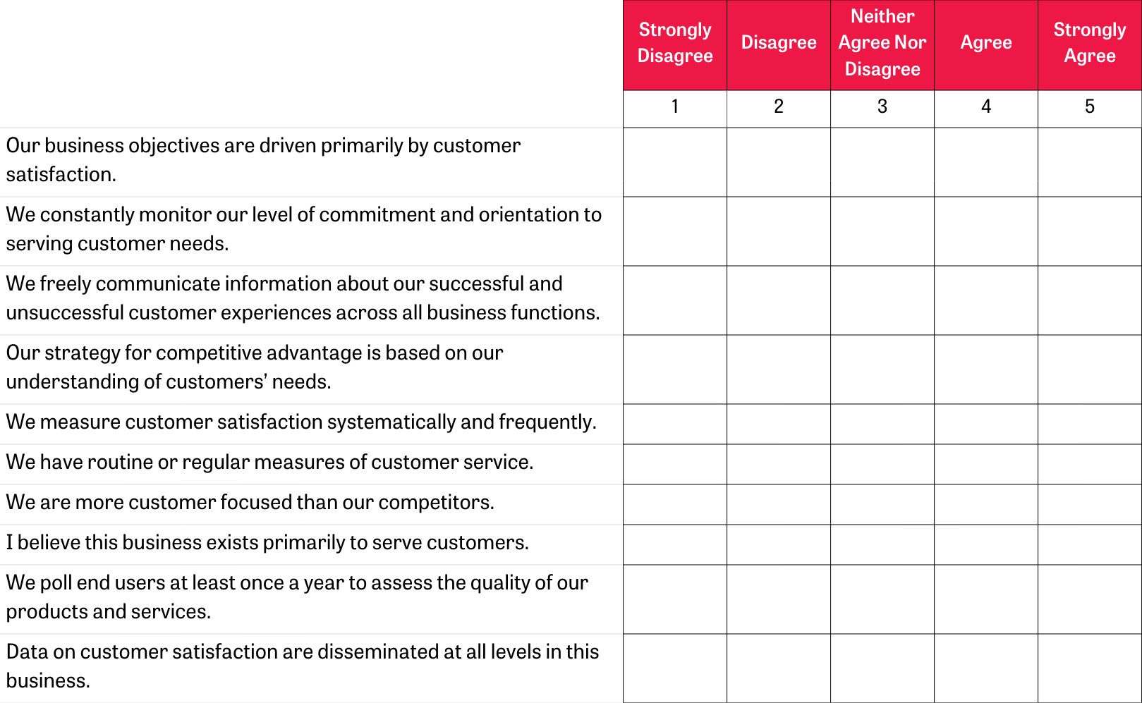 It might look simple, but that’s precisely the point. Deshpandé & Farley’s 10-item scale was exhaustively refined by testing and validating each item across multiple countries and industries. The result is a robust, practical and universal tool that is still extremely effective almost three decades on.